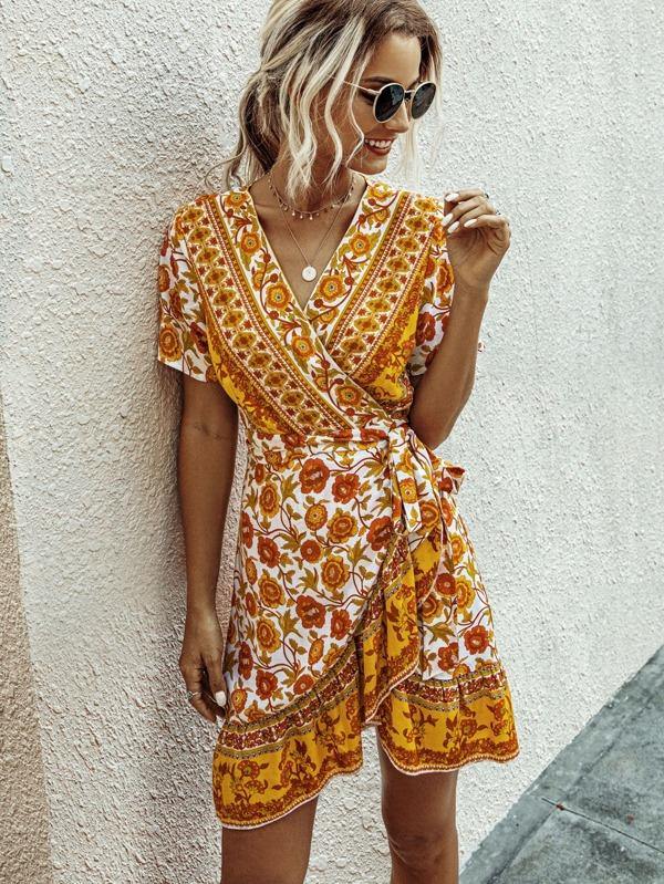 Tribal Floral Print Belted Wrap Dress - $35.00 SGD