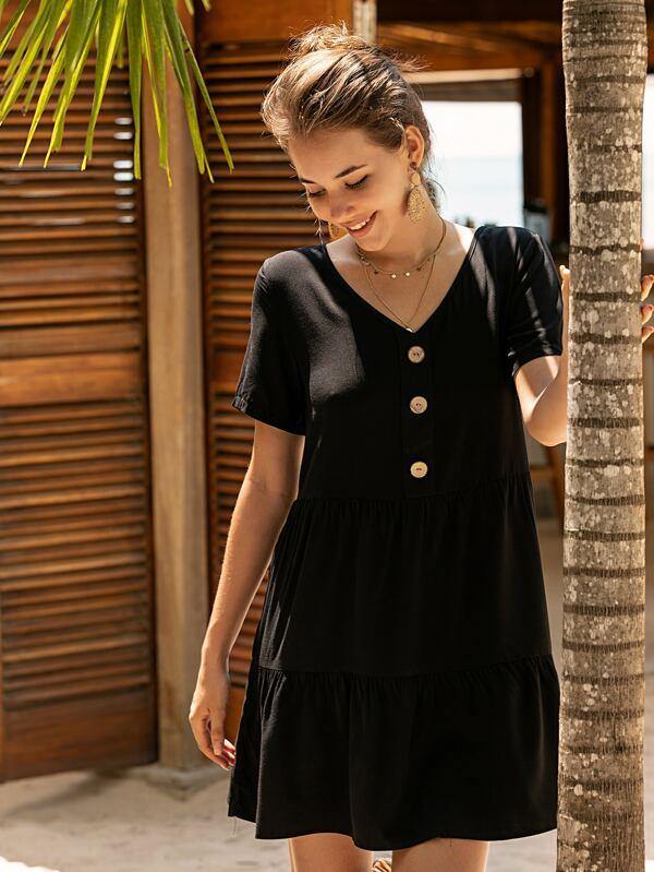 V-neck Button Front Smock Dress