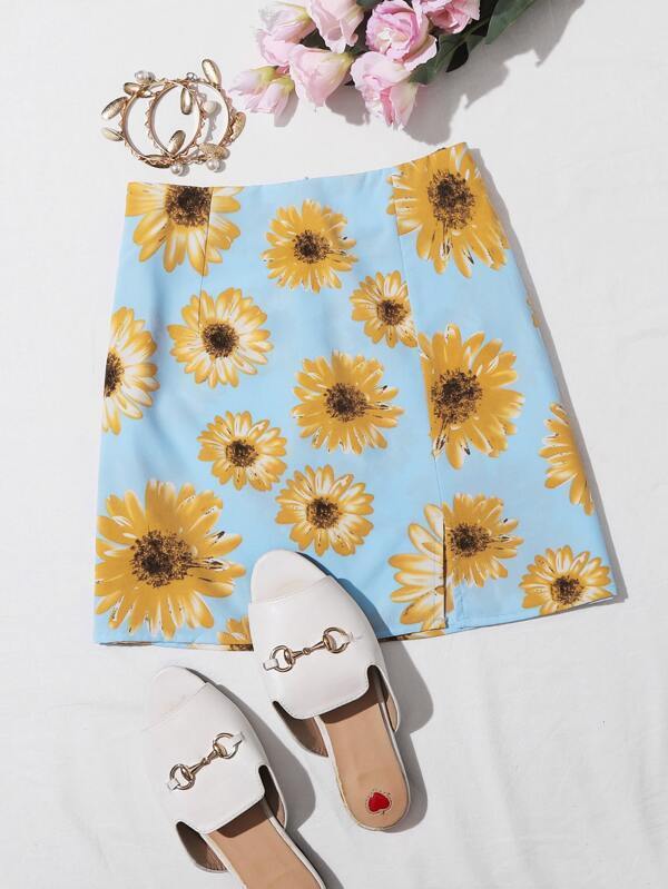 Zipper Back Split Hem Sunflower Print Skirt - $20.00 SGD